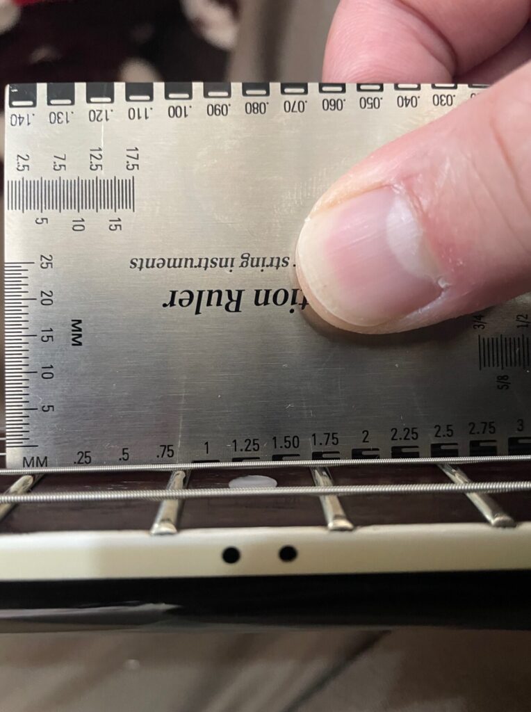今まで使っていた物より太い弦を張ったので、専用のスケールを使って弦の高さを調整しなくてはいけませんが、51歳の私の目ではメモリが小さく、ぼやけてしまいまともに見えません!