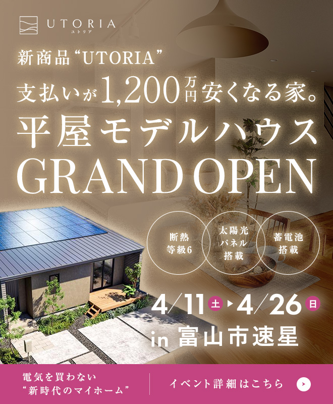 電気を買わない家”UTORIA(ユトリア)”仕様の平屋モデルハウスが4/11(土)GRAND OPEN!