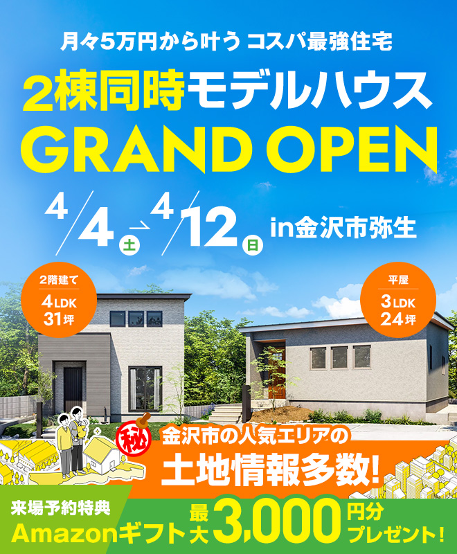 2棟同時モデルハウス 金沢市弥生にGRAND OPEN【土地相談会も同時開催!】